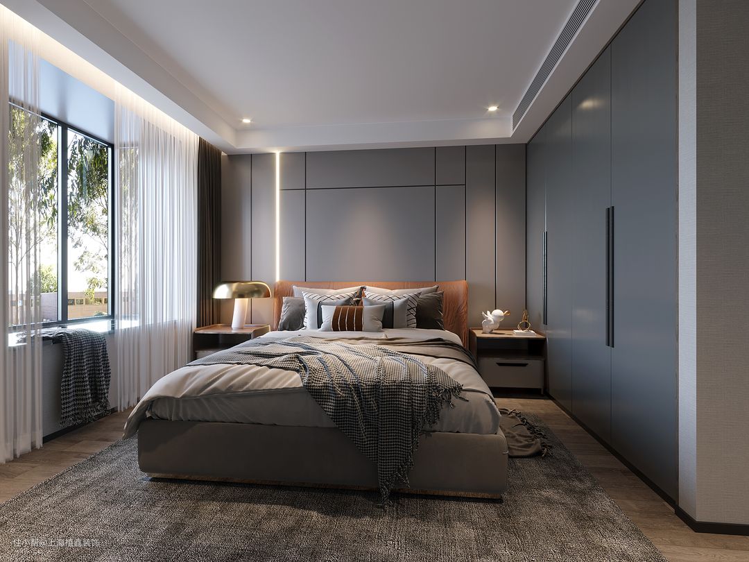 【主卧】灰色护墙板作为背景墙,舍弃了不必要的装饰,与嵌入墙体的灰色衣柜自然地拼接起来,富有现代气息。精致的金属台灯和摆件与背景相呼应,呈现出细腻柔情。
