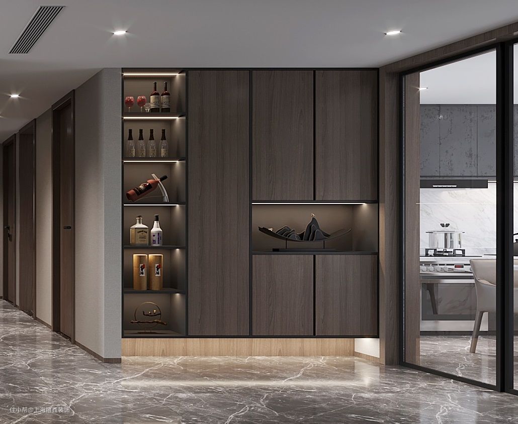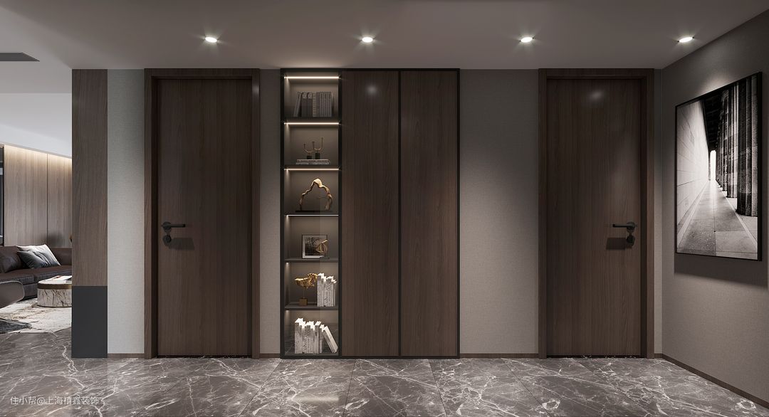 【过道】过道串联起一个个空间,建立起沟通的桥梁。顶上的小灯排列有序,投下明亮的光线。嵌入式的玻璃展柜内,书本和摆件彰显业主的气质和品味。