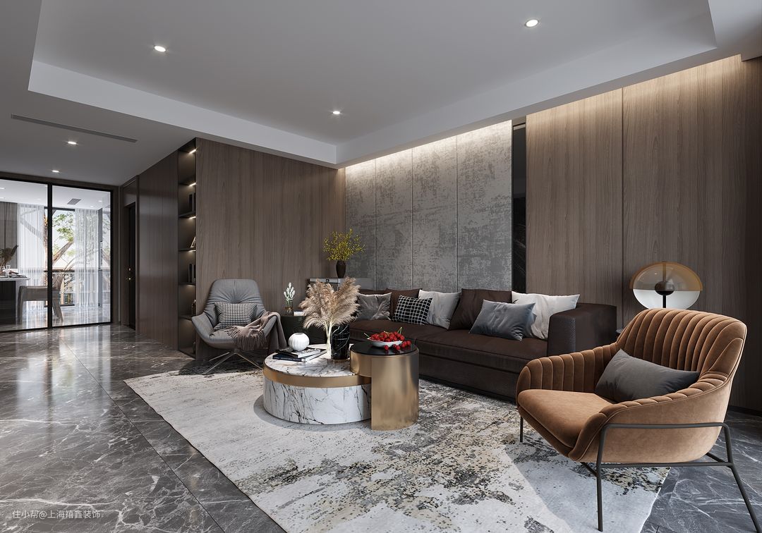 【客厅】灰色护墙板拼接木饰面,方正的深棕色沙发,圆形岩板茶几简约大气,搭配金属包边的质感,营造出了自然、舒适的休闲氛围。