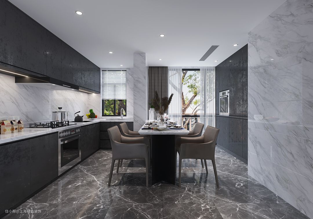 【餐厅】餐厅与厨房同处在一个空间,落地窗采纳外界的自然光线,使整个空间的光影变化更丰盈,呼吸感和明朗感更强烈。岩板餐桌搭配粽子皮质餐椅,传达出家的温情。