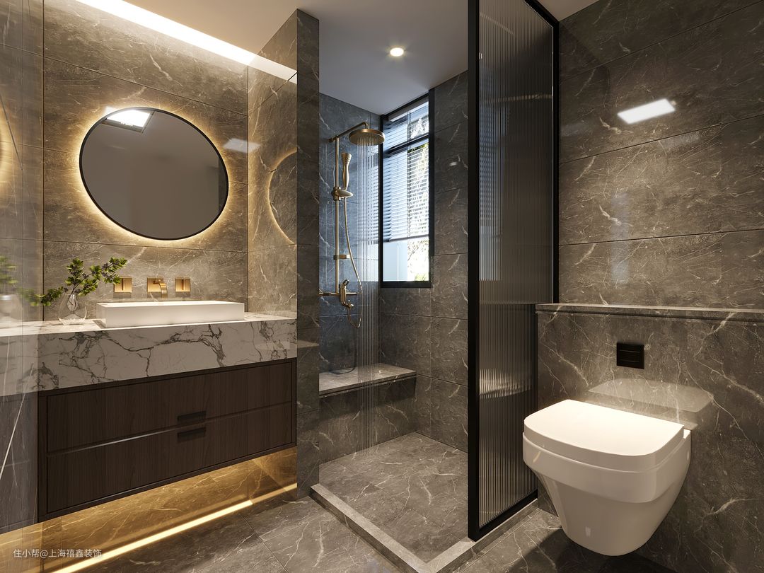 【卫生间】卫生间以灰色为主调,墙顶地一体,带来整体统一的视觉感受。玻璃隔断将干湿区分离,悬空的洗漱台与储物柜,利用白与深木色碰撞的张力,增强空间的轻盈感,令人更加放松。