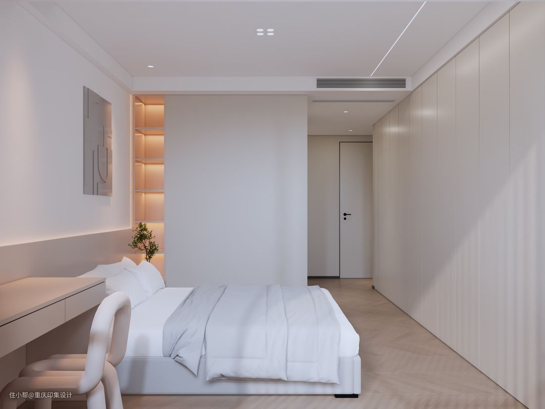衣柜竖条纹、床头竖线灯与墙上横向线性灯,在空间上交错着,有一种独特的线性美感。一床、一柜、一灯,抛却繁杂,质朴简洁而不失淡雅。