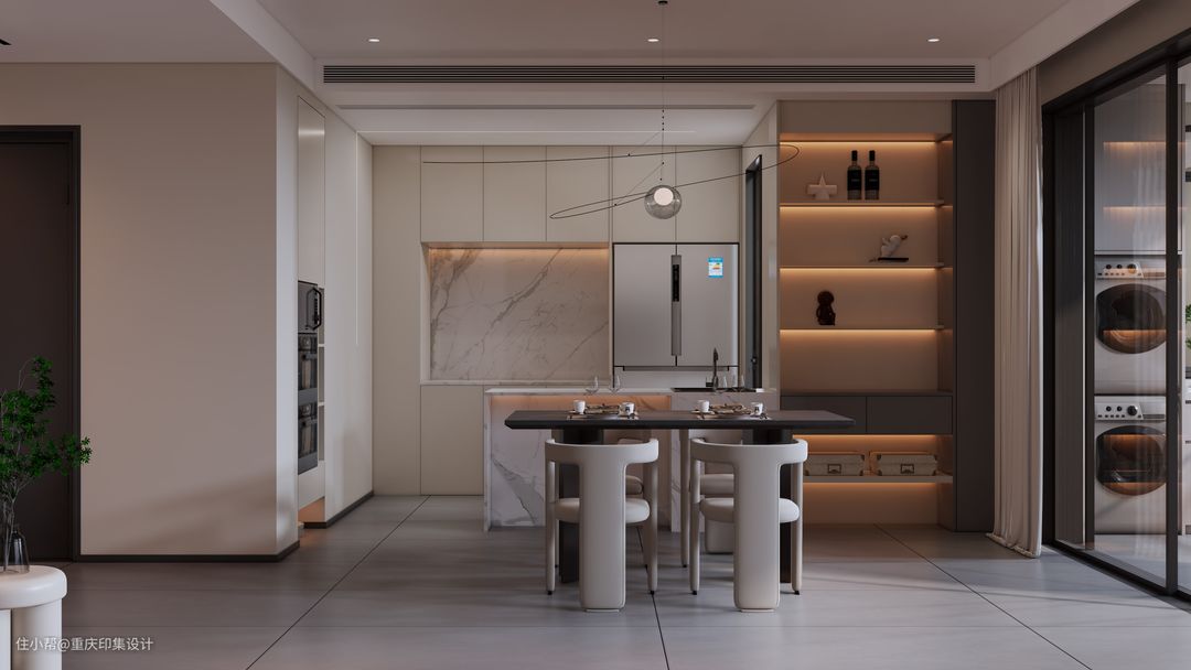 客餐厅浑然一体,不作分区,开间更宽大。中西厨设计,实现功能分流,便捷、实用。