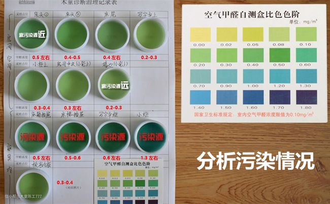 左数第三个检测结果是学习桌下面的柜子,检测值0.6左右,图2第一排最右侧的是窗台下面的小柜,这个小柜是个床头柜,甲醛污染最严重,柜内甲醛检测值达到1.3毫克,颜色已经变为深蓝色。我在《木童甲醛自测盒使用说明书》中提醒客户不要忽视小家具,一定要检测小家具,小家具污染重,眼前的这个真实的案例就说明了这一点。