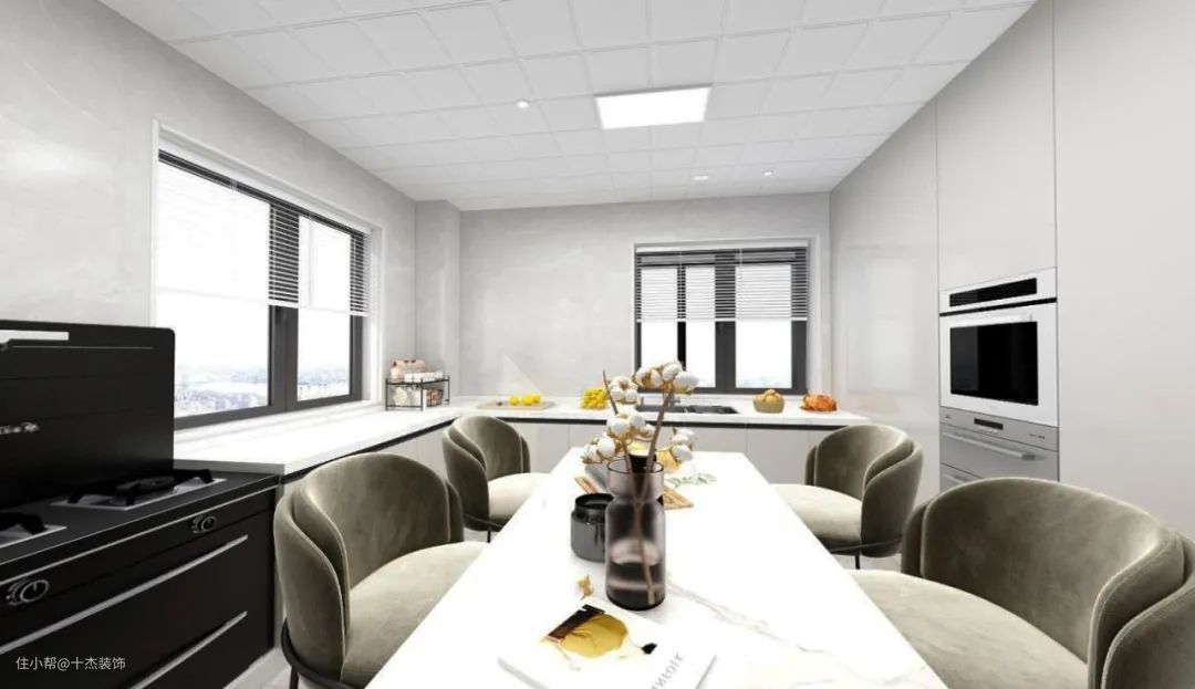 ▲厨房,一个家中使用最频繁、最重要的地方,L型的橱柜设计+岛台设计+餐桌组合,充分利用每一寸空间,烘焙、炒菜、炖汤.....功能齐全且合理舒适,再搭配黑白灰三种高级色,将开放式的餐厨空间衬托得更加现代时尚!