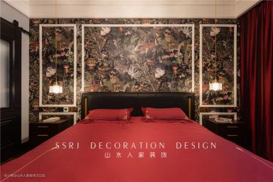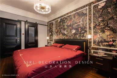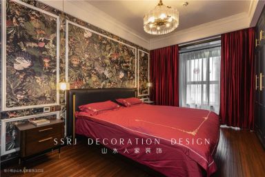 主卧整体构色呈瑰红色,墙体是色彩斑斓的壁画墙纸,吊灯放出柔和的灯光,有助于夫妻睡眠,黑色床头柜储物功能极佳,上面设计了壁灯,女主人的精致妆容在此诞生。最里面还设有次卫,另一边预留出较大空间,留待婴儿床,后期也能设置成衣帽间,循环利用。