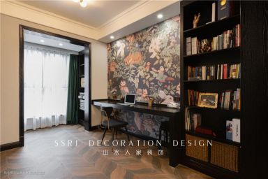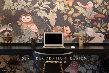 这是一处静谧的空间,有着瑰丽奇特的壁画墙纸风格,丛林生物在灌木中若隐若现,空间因而变得活跃。于此办公,思维也变得愈加开阔。书房的操作台面长而大,未来一家三口都能聚集一起工作学习,多么美好温馨的氛围。