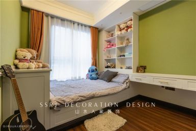 儿童房整体构色偏浅绿色,跟主卧的红绿对比更加突出,显示轻松灵动的空间特质。应用榻榻米,获得更多的储物空间,孩子玩乐的区域增加,快乐自是不言而喻。
