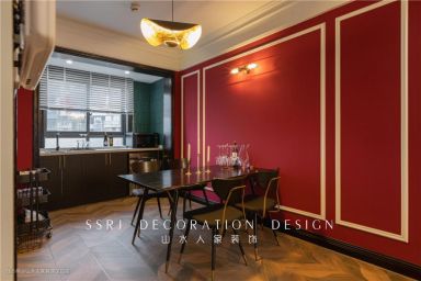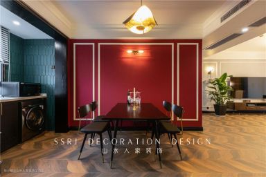 餐厅和客厅一体,铺设的均是柳叶型的仿木瓷砖。暗红、墨绿色墙体的鲜明对比,陡增华丽之感。值得注意的是,踢脚线从8cm增到12cm,复古感与日俱增。过道尽处,更有一幅简易抽象画,给古典一点新潮。