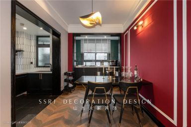 业主起初是想打造整屋全绿系配色,营造暗黑森林的氛围,但遭到其他家人的反对,经过跟设计师的沟通,决定采用红绿对比色,借鉴古代传统建筑的设计工艺,摈除一些华而不实的构设,相应做减法,更加贴合现代化生活需求。