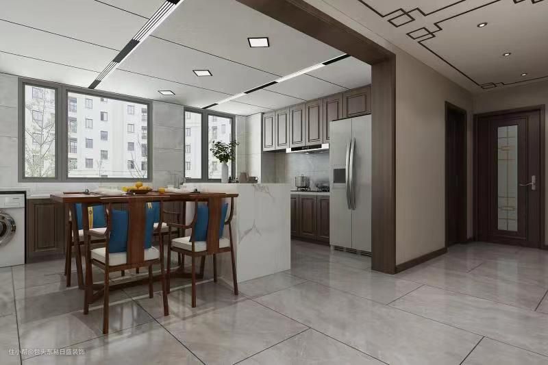 餐厨一体化设计,增加做饭时家人间的交流、互动。开放式的餐厅和厨房使空间打开,让其更加宽阔整洁。餐厅是木色为主搭配白色的大理石,明亮且温馨。