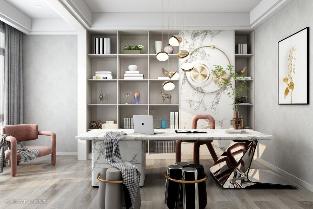 与屋内色调一致的大理石书桌,靠落地窗而放的粉色单人沙发,颜值高功能佳的TATA木门极简降噪门,累了便可以抬眼看下窗外的美景,沐浴阳光,享受静谧时光。