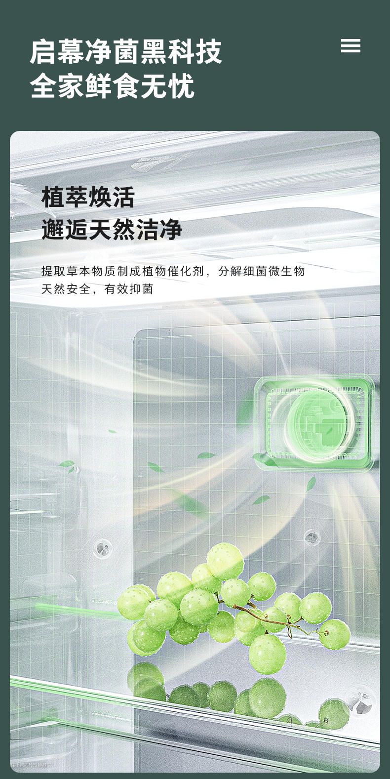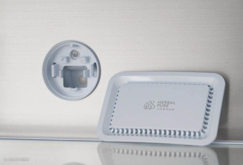 在冷藏区上方的出风口处,有天然草本抑菌模块,内有提取草本物质制成的植物催化剂,可分解细菌微生物,抗菌率达99.99%。
