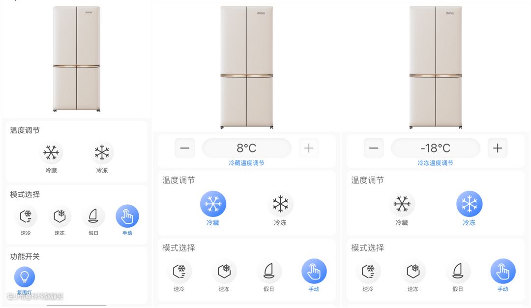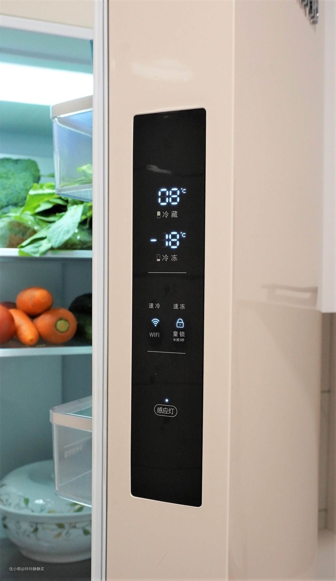 冷藏室、冷冻室温度调节,速冷、速冻、WIFI、童锁及感应灯开关,都在这里控制。