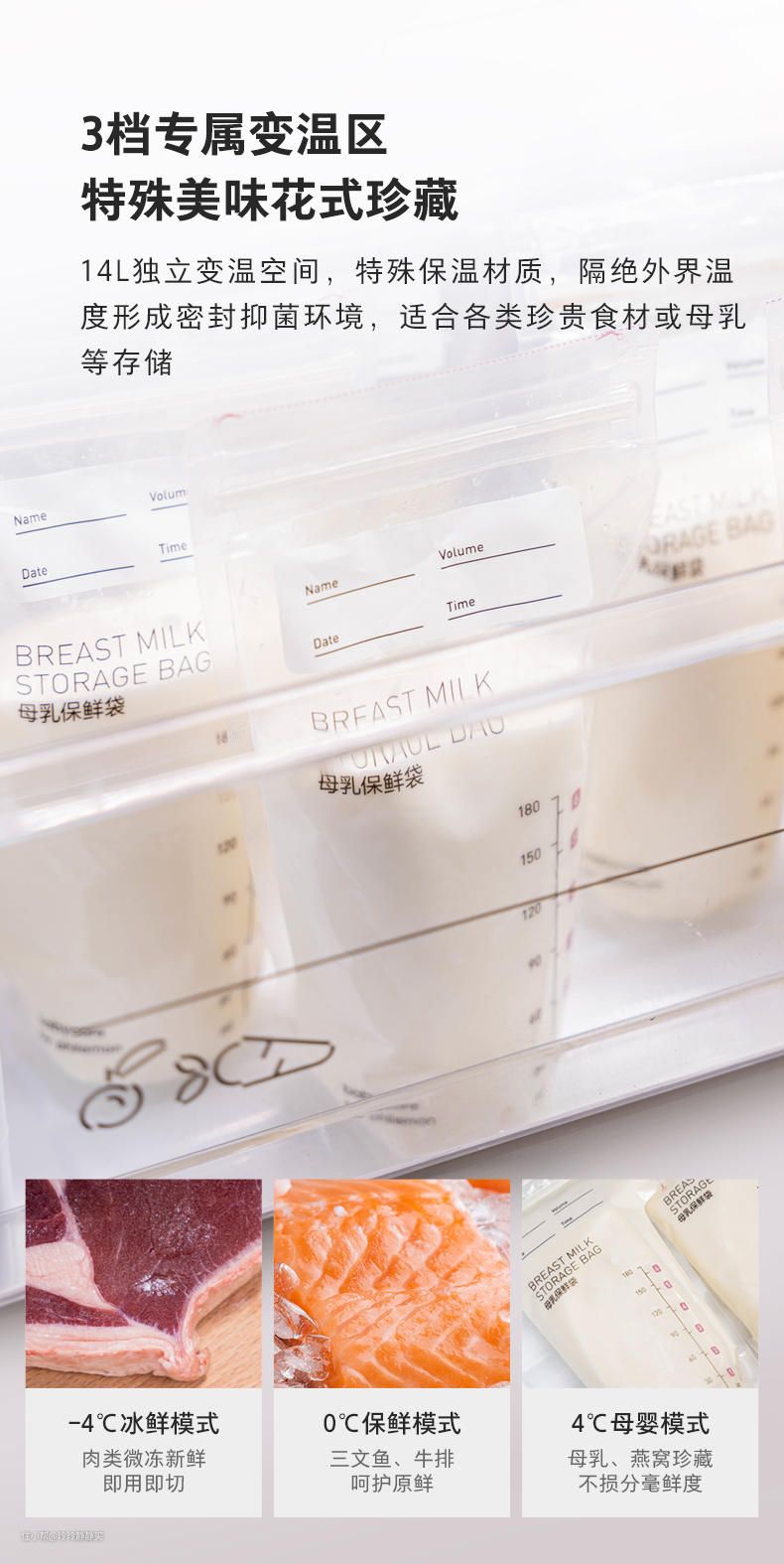 14L独立空间,可有-4℃,0℃,4℃三档变温,对应冰鲜、零度保鲜、母婴使用需求,妥妥的人性化科技应用亮点。