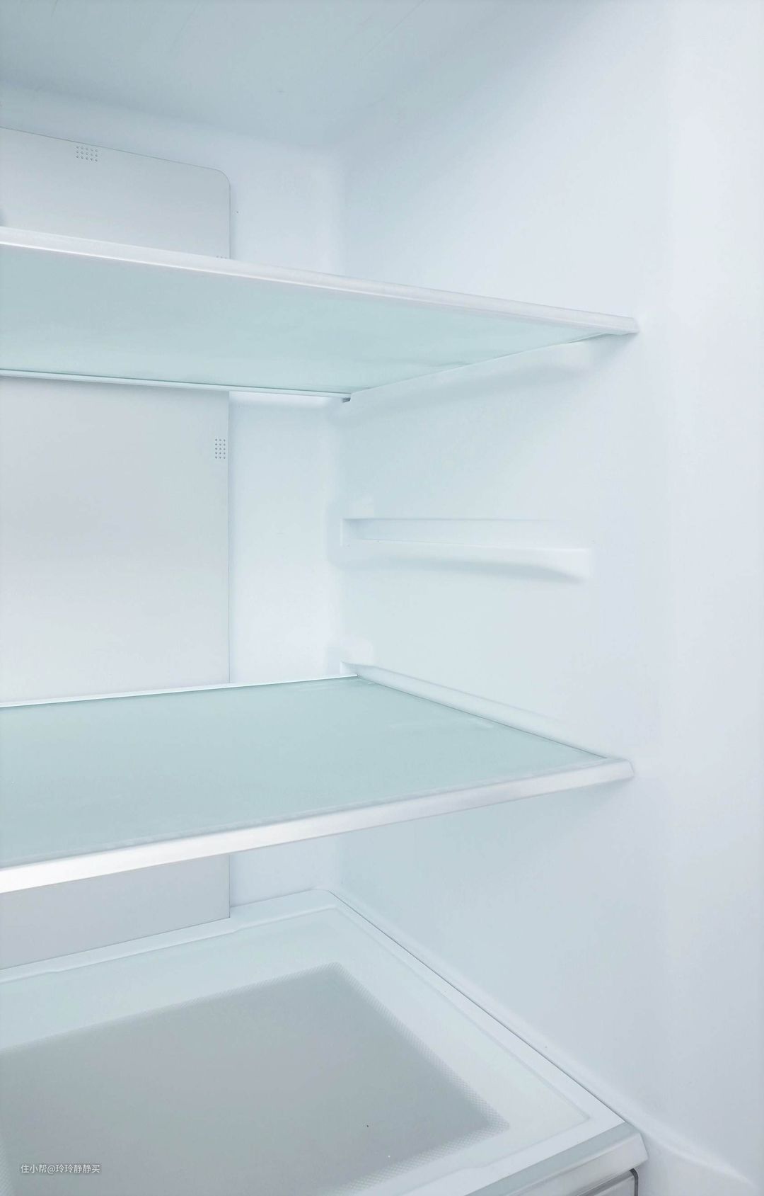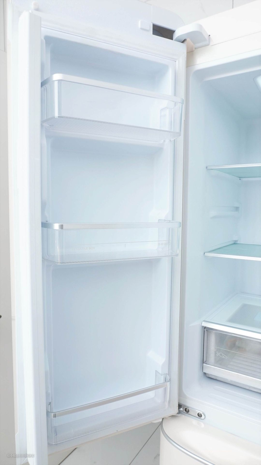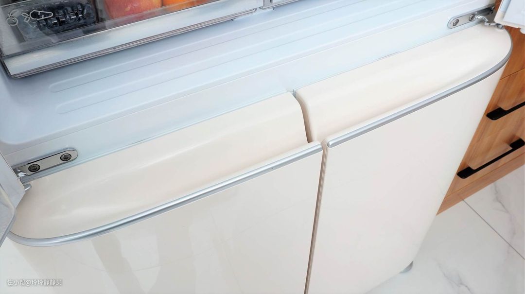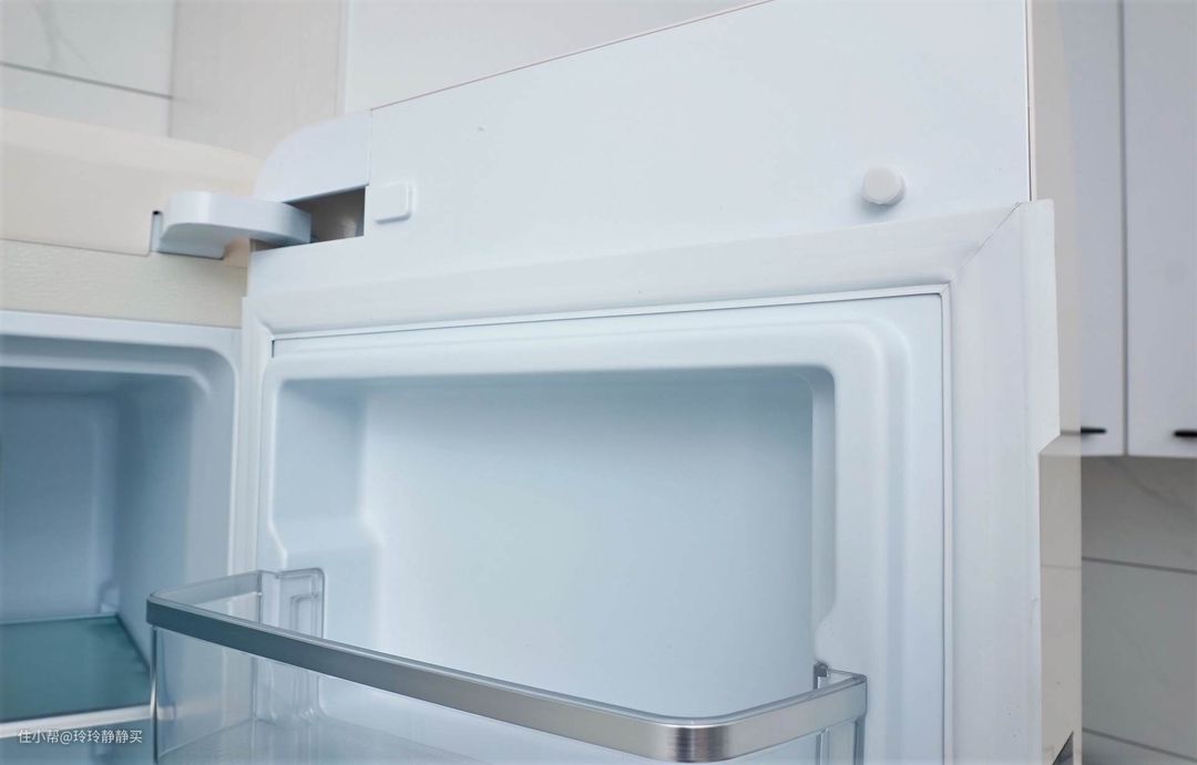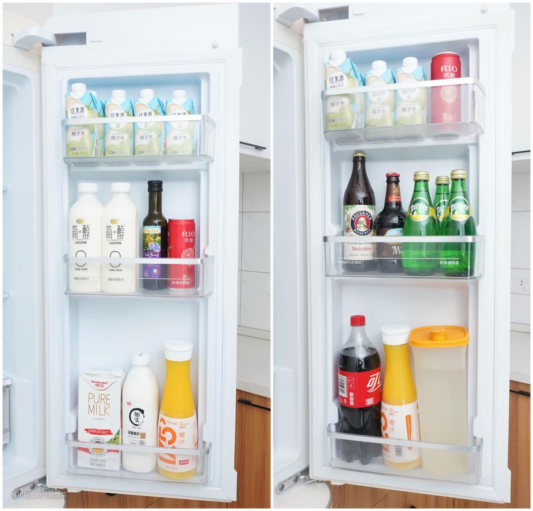 冷藏室的两个门内,都有三层储物瓶框。由于圆润R角外观和隐藏式LED开门侧显的原因,小吉冰箱的门略厚。