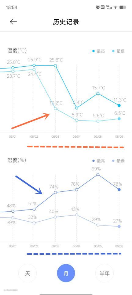 温度计在APP上的最低温度和最高湿度的记录,也能比较清晰的反映出冷藏区的控温和控湿能力。