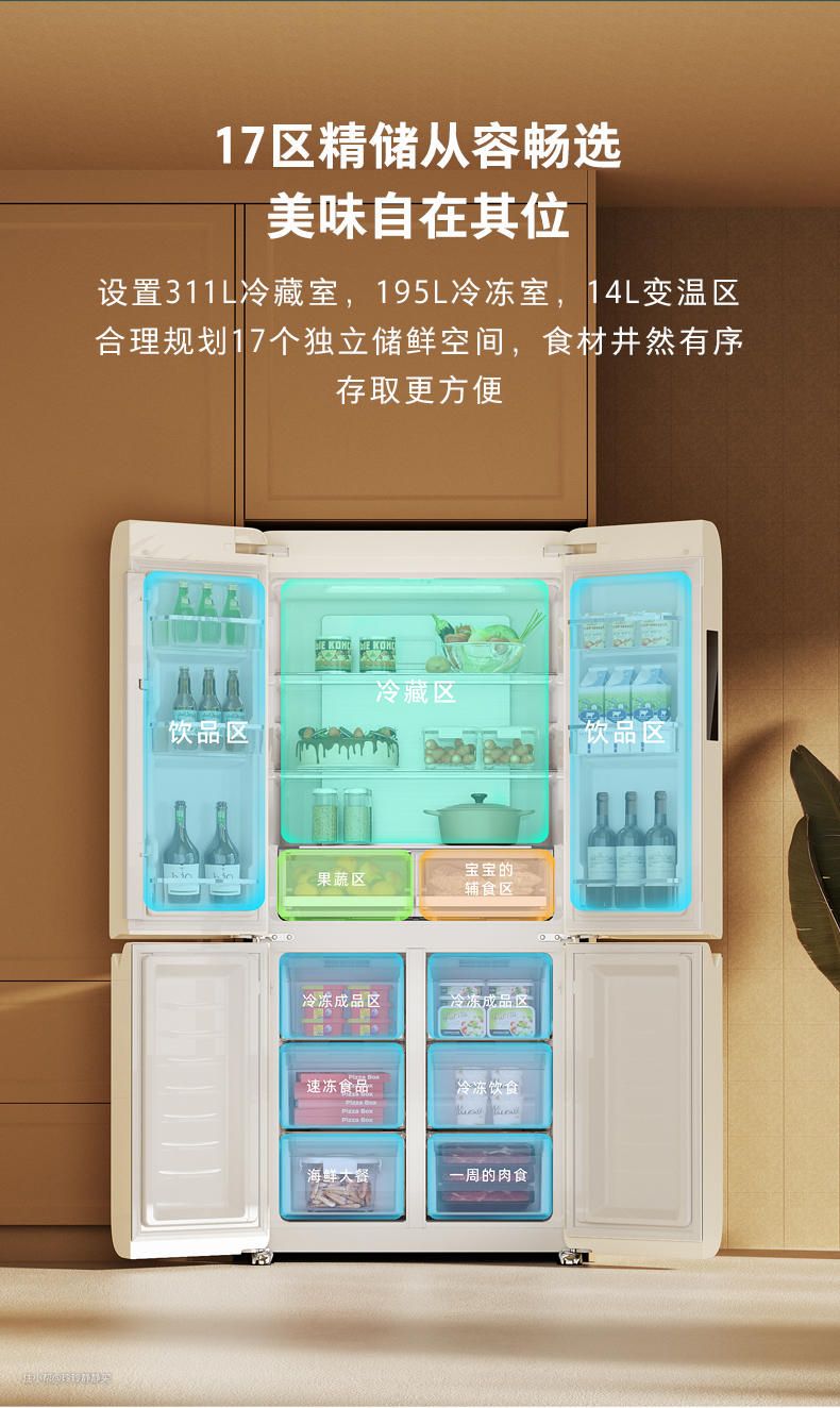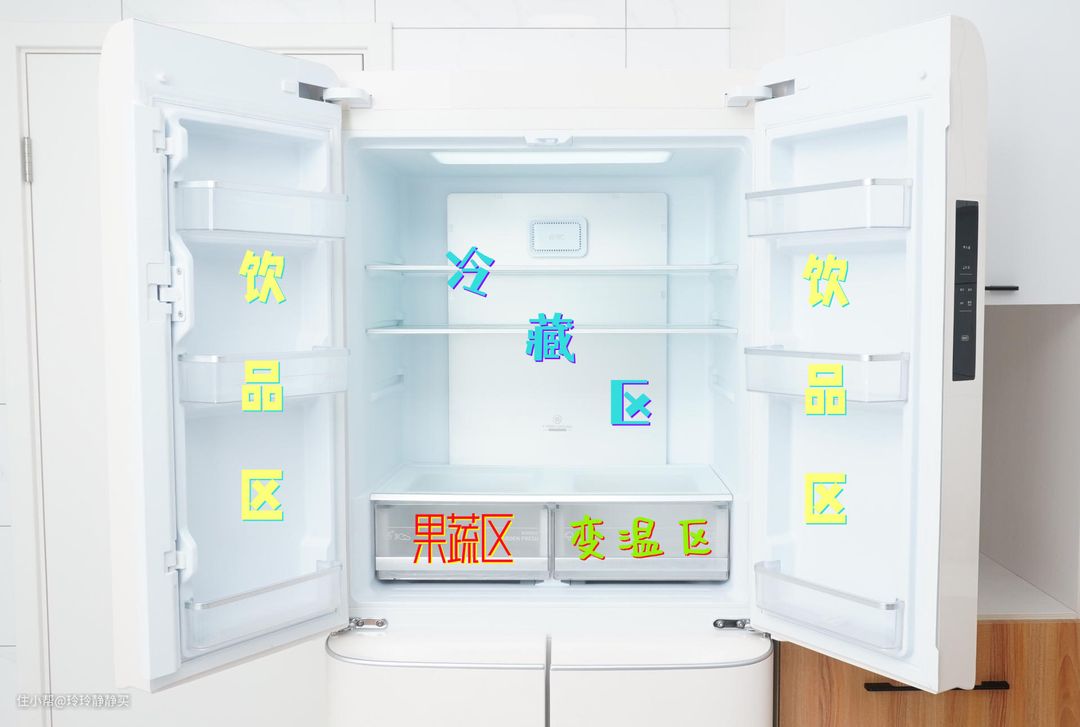 该款冰箱还有一个465L容量的,相同配色差了500元钱。主要区别厚度薄了7㎝,把变温区改成了更适合干果储存的“珍品干储区”。