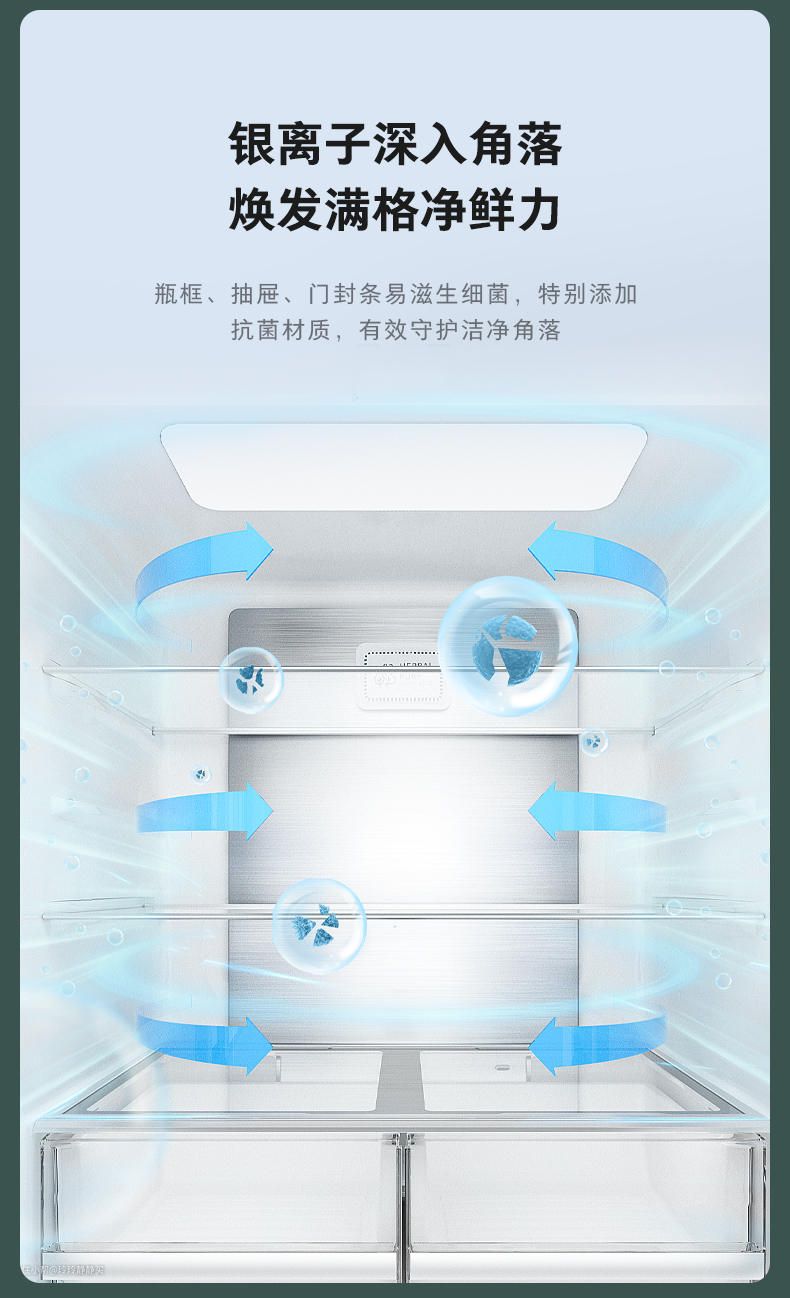 天然草本抑菌模块、超碳吸附模块和银离子抗菌材料的综合作用,从源头上增加了冰箱的保鲜能力。