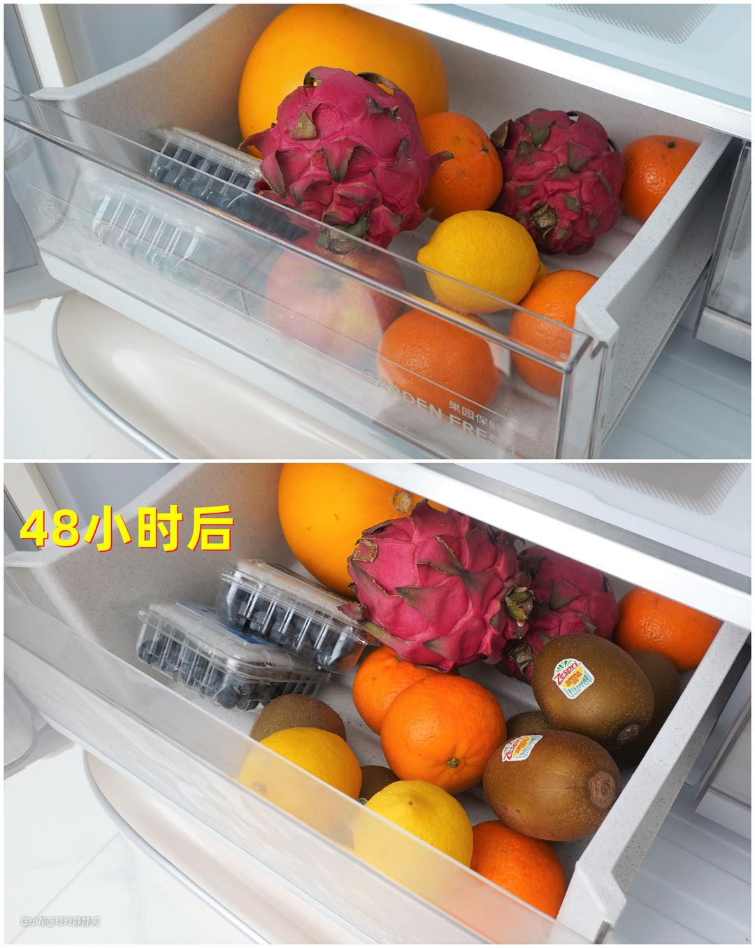 果园保湿区在左,抽屉上方玻璃板下淡蓝色部件是保湿模块,有加强保湿的效果。