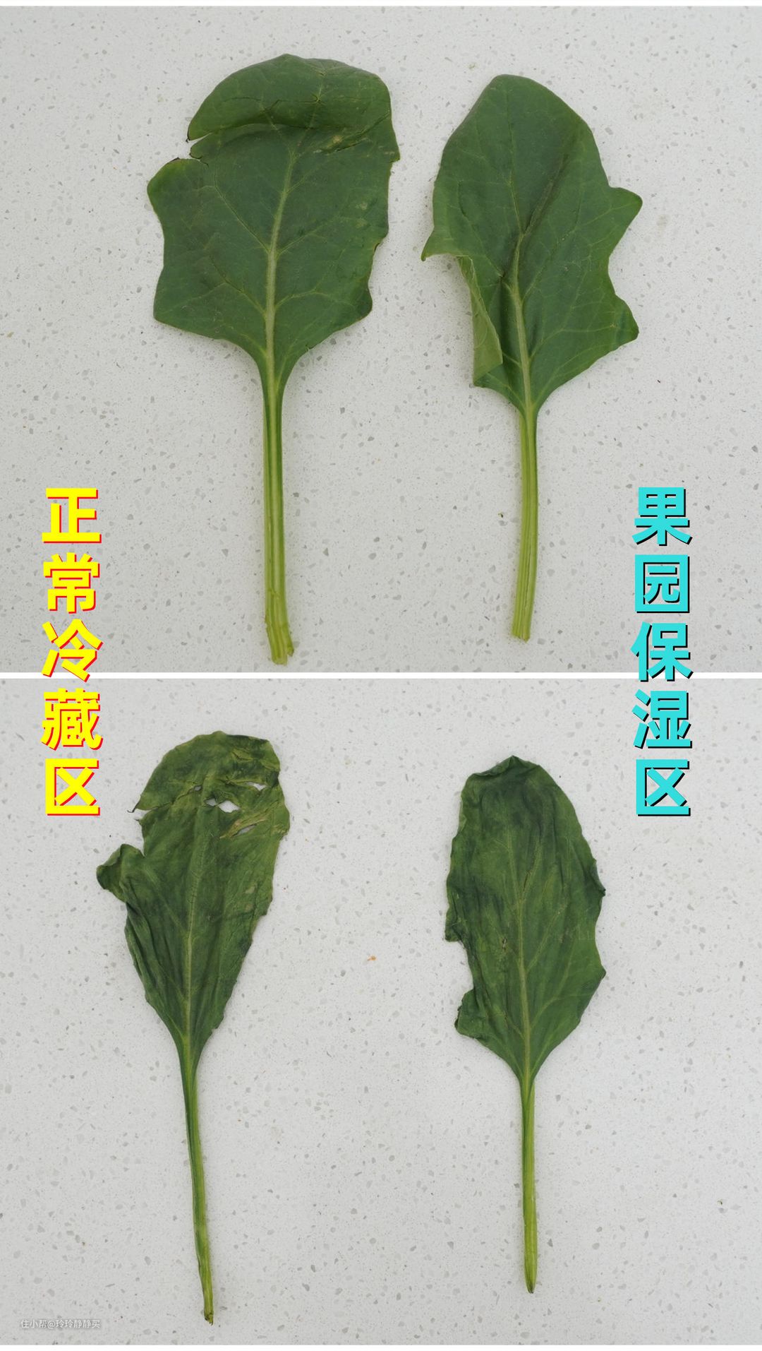 两片菜叶,分别放在正常的冷藏区和果园保湿区,两天后对比如下。