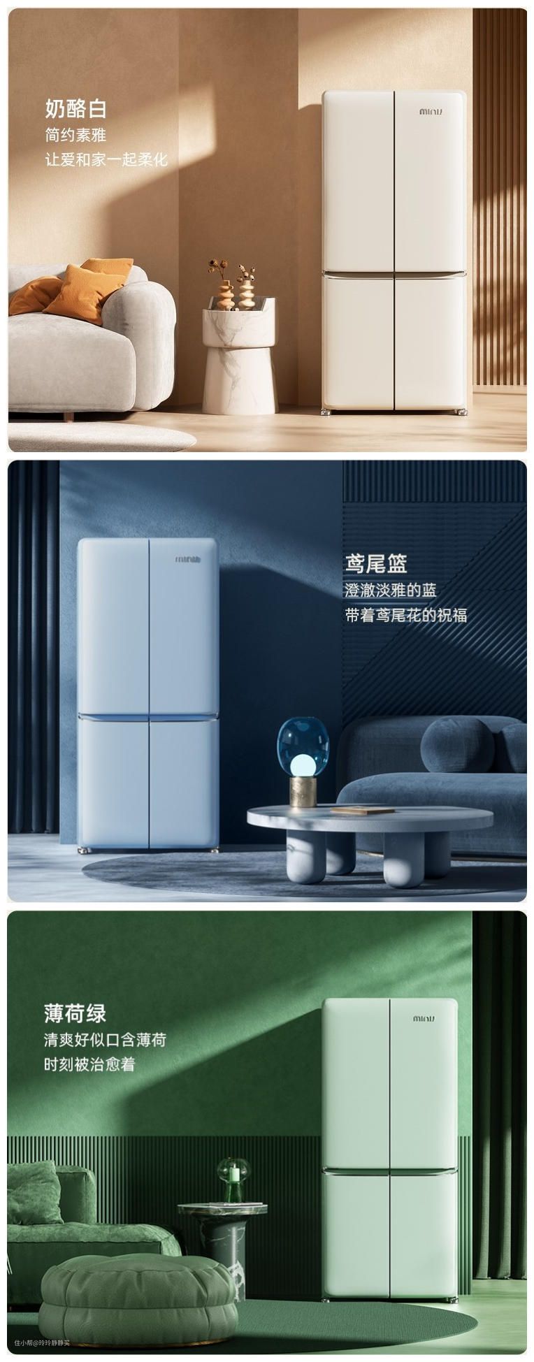 BCD-JS520W十字门复古冰箱,是小吉的新品,分520L和465L两个容量,有奶酪白、鸢尾蓝、薄荷绿3种配色。