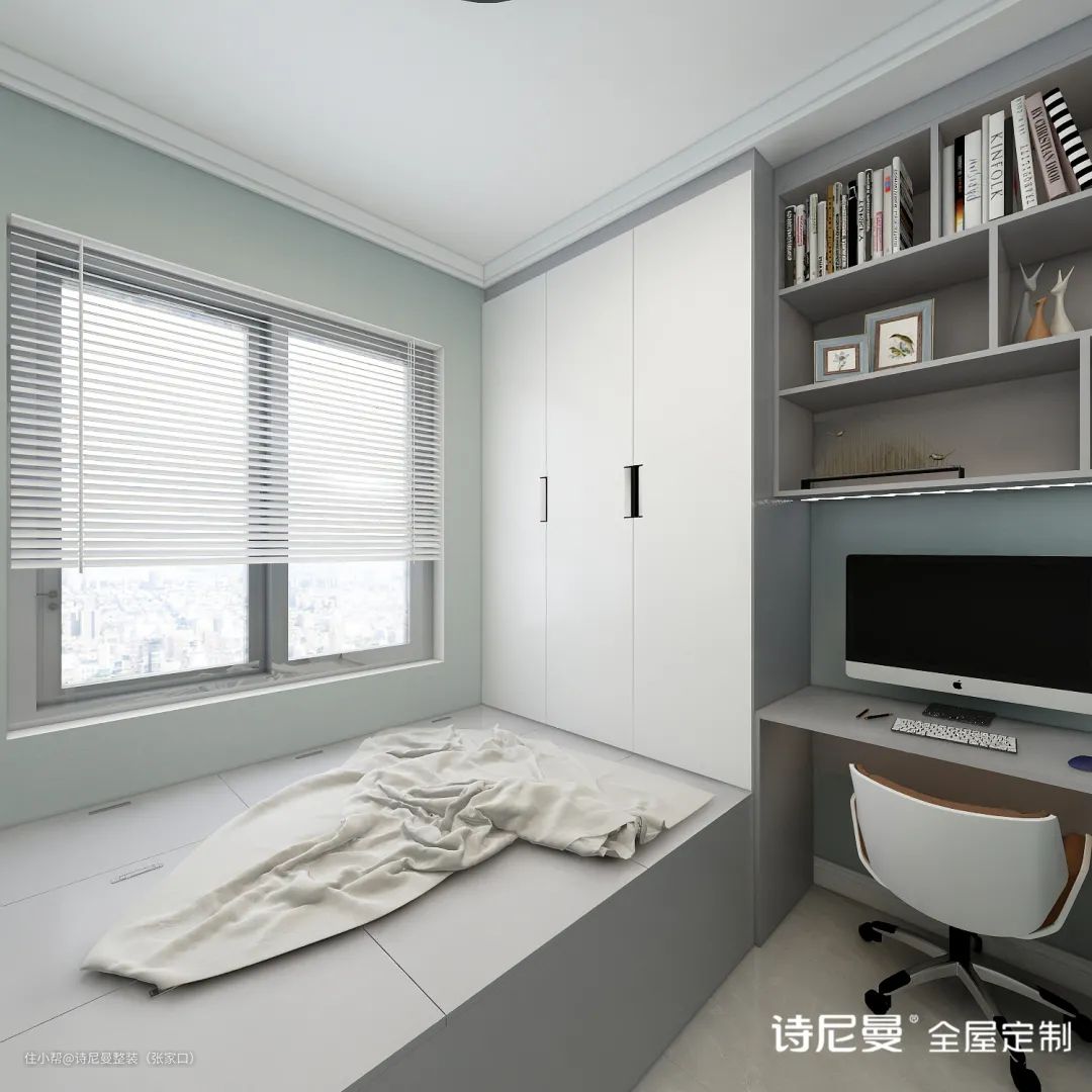 再来说说床,儿童不宜睡软床,因为不利于骨骼发育。定制榻榻米是一个很好的选择,除了睡觉,下方的储物柜可以收纳书籍、玩具、衣物等等,收纳功能强大而且空间利用max。