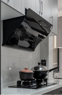 厨房的烹饪区,我们选用了黑色的灶台厨具,搭配鱼肚白的瓷砖,形成鲜明的对比。这是业主做饭的“主战场”,因此需要维护好此处的卫生环境。