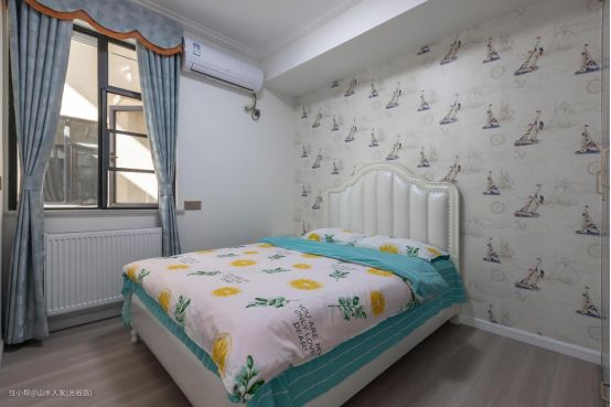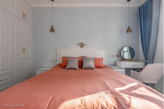 主卧背景墙用的是蓝灰色的墙纸,呈现温馨典雅的特点。墙上没有任何的装饰,就是这么的简单随意。内嵌式白色衣柜的设计,既节省了空间,又凸显洁净的观感。