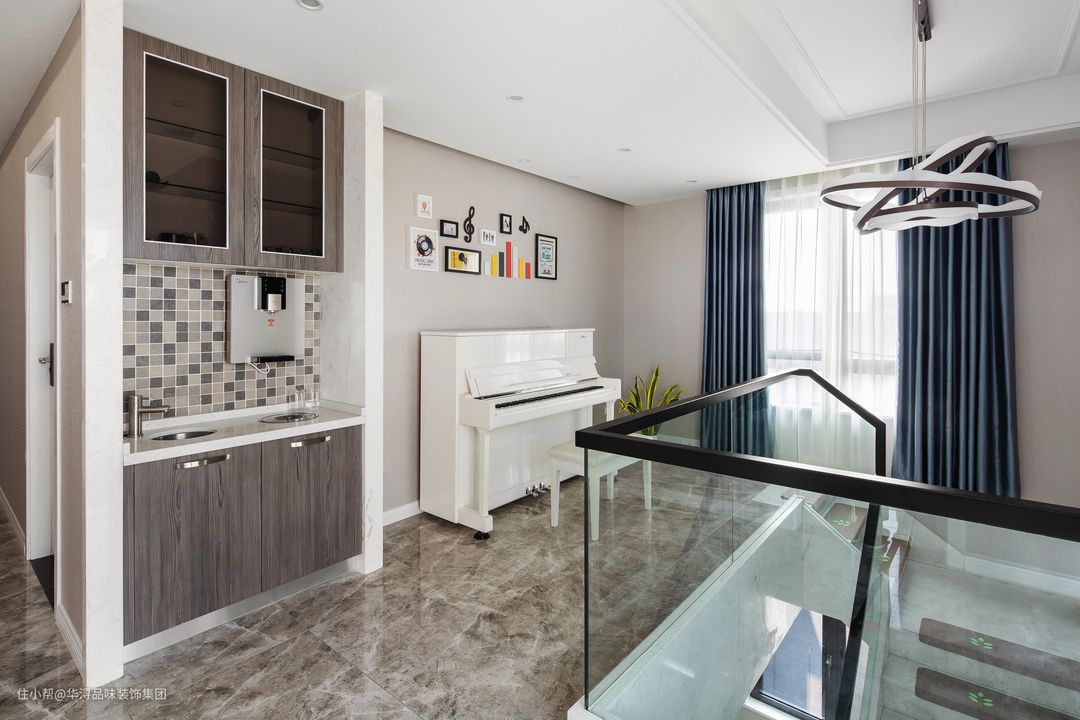 钢琴与水吧位于二楼楼梯拐角处,利用楼梯位置设计的这样的一个小型休闲区,不仅避免了位置上的空旷,同时也非常好地将这一片区合理打造起来,钢琴的纯白色与柜子深灰色搭配,更使这片区域低调又独特。
