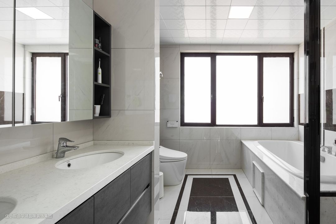 去繁就简的设计,爵士白石材、灰色大理石瓷砖等一系列装饰以跳色的设计手法将空间打造颇具现代化。