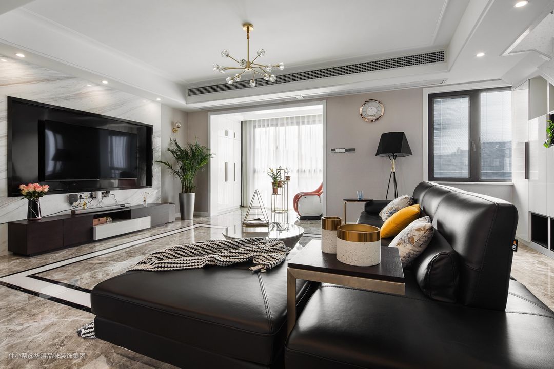 选择黑色皮质L型沙发舒适感更强,大气低调;选择现代颇受年轻人喜爱的激光电视,让科技之光在家具中更为突出展现,住户感受科技的美好。