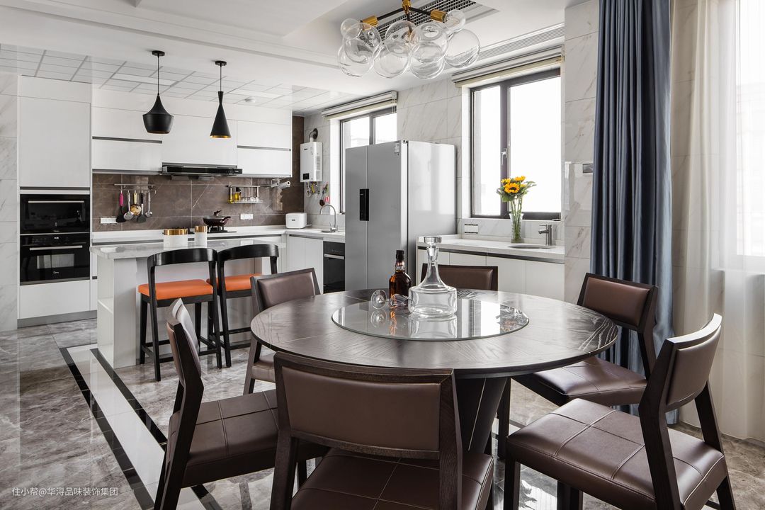 吧台作为连接开放式厨房与餐厅的中心区域,使整体空间既有西方的的休闲又有东方的沉稳。