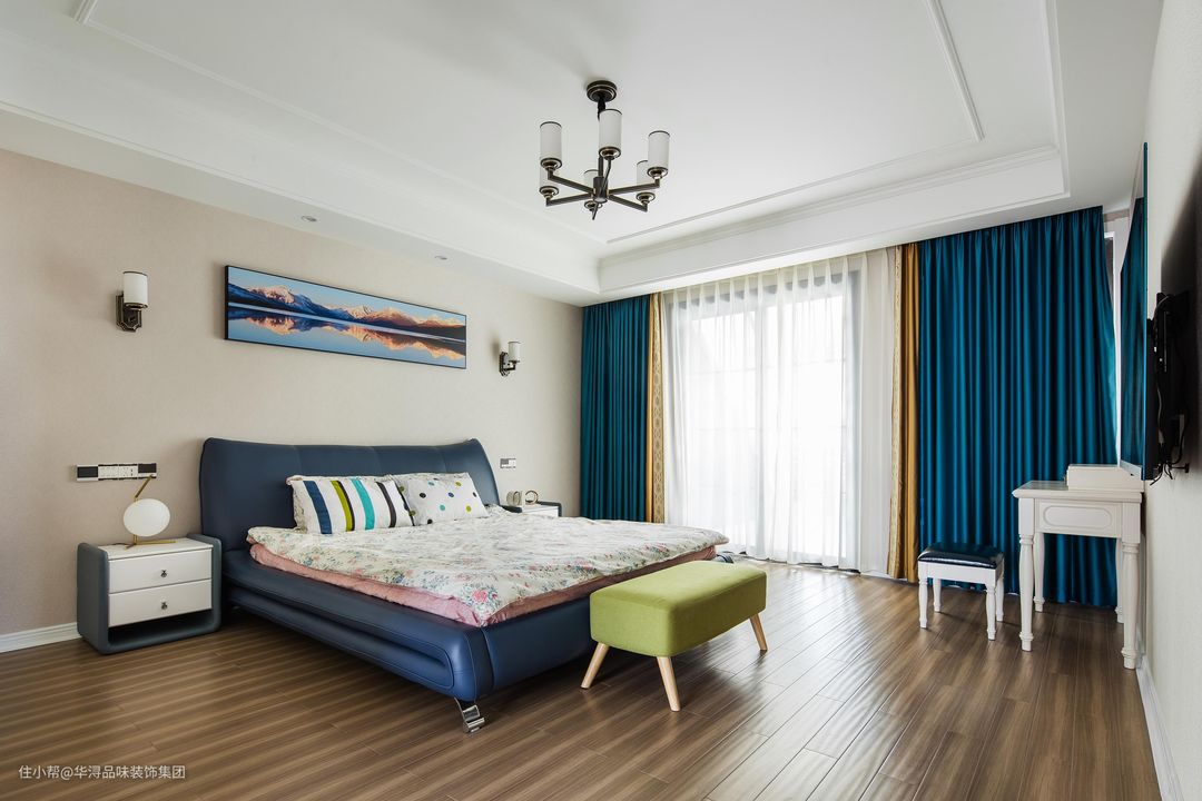 选择蓝色与金色窗帘拼接式,更显大气低调;选择山水倒影背景画,让整体主卧背景墙色彩鲜艳,文艺感十足。