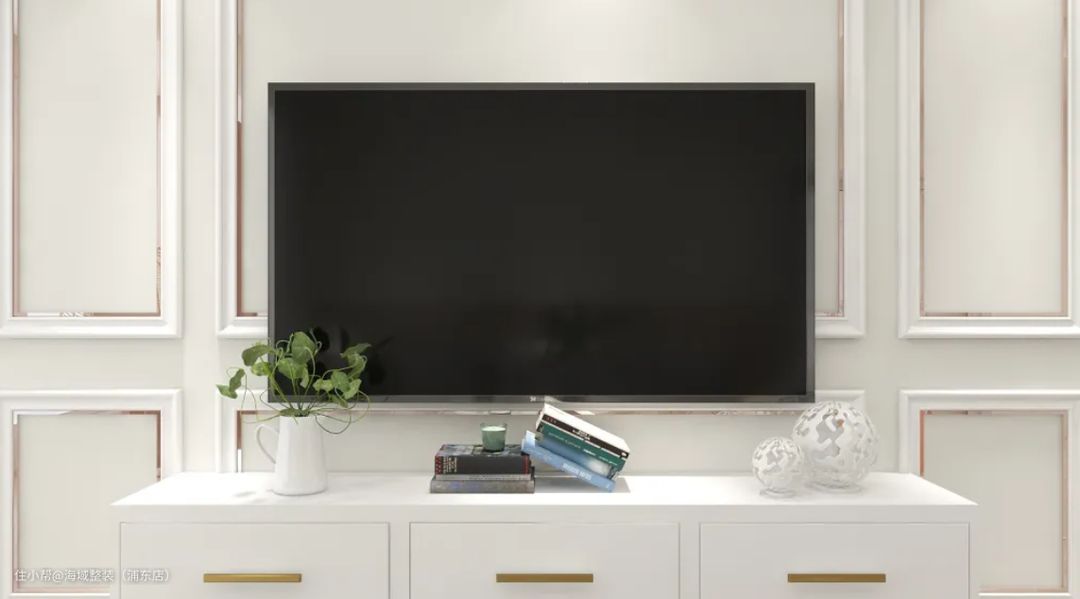 一眼看去,虽仅有白色,但画面却不单调,法式轻奢的设计理念里,黑白灰为主色调。白色的墙面,柜子,低饱和奶油风的浅灰色沙发,搭配有黑色线条的地毯,点缀少量金属色作为提亮色,浮雕切割出的立体背景线条,让墙面变得更具层次感。桌面上摆放的绿萝,让空间里增添了一丝生气和生机。整个画面清新自然,不失气质。