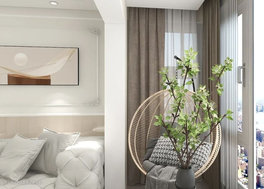 试想,窗外天阶夜色凉如水,窗内灯火摇曳迷人眼。亦或是,落日之时,余晖把原木色藤条的吊篮也沾染成了夕阳的颜色,恰好此时,窗边的轻纱伴随微风起舞,坐在吊篮里,感受失重,又悠然自得。若是突然凉意来袭,藤椅里灰色的披布和抱枕便能派上用场。