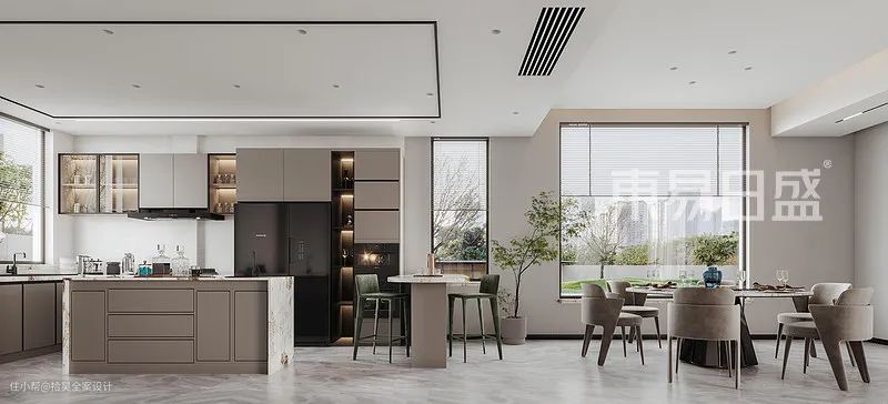 延展的餐厨区域由开放式厨房、中岛台、吧台与餐厅共同构成,大小不一的窗扇组合为明亮的视觉效果奠定基础,并由此引申出绝美的四时窗景。