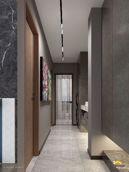 3:走廊的墙上设置了一排储藏柜,开放隔,玻璃门,平板门三种不同形态,材质的有机结合,让走廊空间更具立体感。