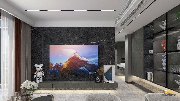 黑色大理石的电视背景墙非常简约,质朴自然,旁边摆上自己喜欢的手办和插画,带入了几分轻奢时尚感。