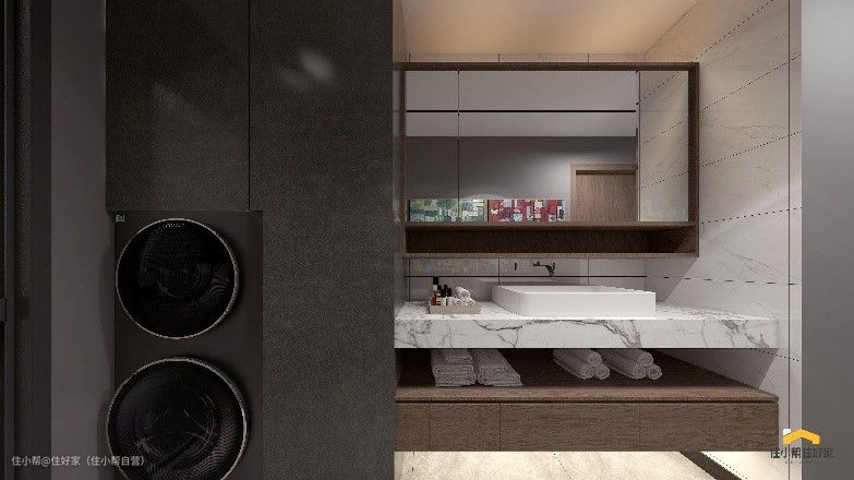 卫生间用灯光+镜面的方式营造通透敞亮感,并且做了干湿分离,白色的墙面和台面显得空间十分干净整洁。