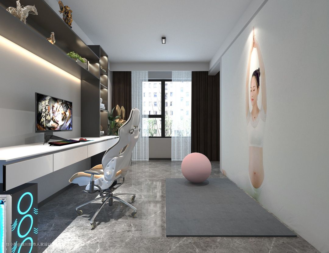客厅沙发墙后打造的书房兼瑜伽室,靠窗处与客厅互通,简简单单的设计同时满足业主办公、休闲、收纳等多种需求。