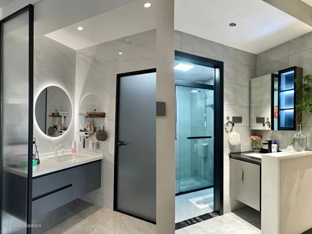 第二:湿区千万不要做木门,受潮、发黑、变形都是早晚的事,要选就选择镁铝合金门,价钱便宜而且防潮效果还很不错,记得在选择的时候要选择极窄边框,玻璃要选择磨砂玻璃、超白长虹玻璃,简约又好看。
