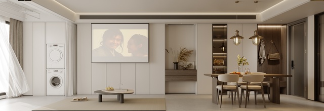 ①设计入户左边为完整长排柜子,增加储物空间的同时,使整个空间更加的开阔明亮;②厨房改小使客厅空间更开敞;③原次卧改成多功能房有书桌也有黑板适合办公。④长排餐桌增加空间气势,给过道留足位置。