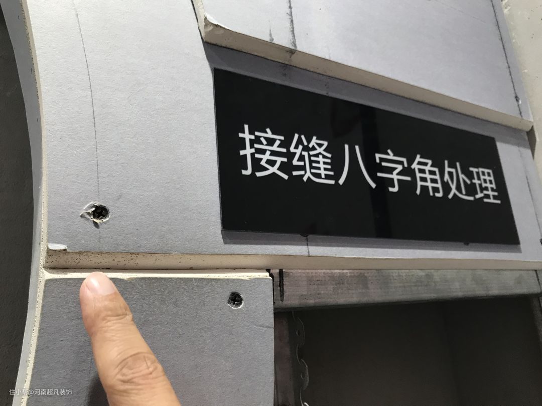 另外,石膏板之间的接口缝隙,推荐借鉴公司使用的“接缝八字角处理”,再接缝处嵌入石膏后,再用网格布贴上处理,保证后期接缝不开裂。