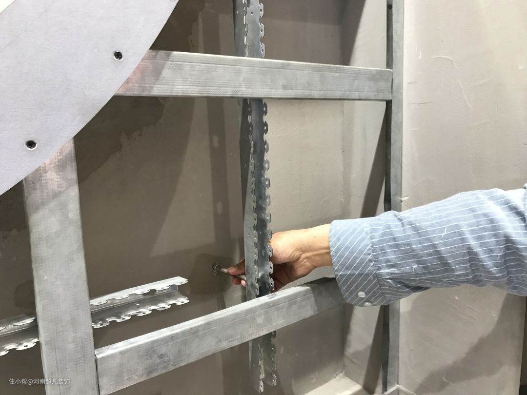 在石膏板的固定上,很多装修工人都使用气钉枪直接打入,“这种做法容易在后期受潮气影响,表面起泡像起了麻子一样,很不美观。公司使用防锈螺丝来固定,然后在裸露部位涂刷防锈漆,可以避免后期螺丝钉生锈和铁锈渗出。
