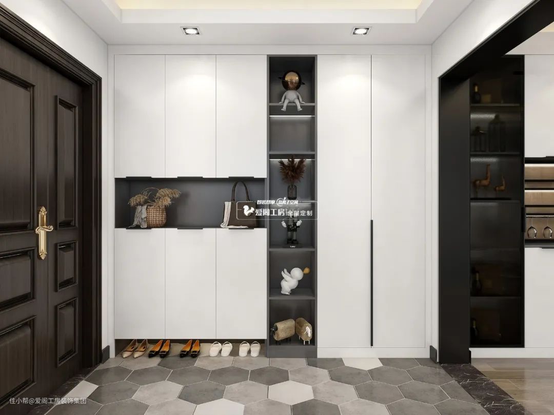 ①玄关:鞋柜中间采用开放格,收纳包包、钥匙等常用品,同时兼顾展示,实用美观。