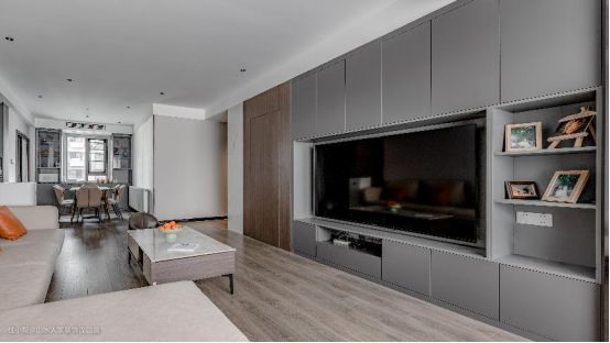 而电视背景墙做的是电视柜的形式。灰色肤感膜柜面的质感肉眼可见,其内部更是有着充足的储物空间,功能性大幅提升。旁侧还用木饰面做了装饰,并作了隐藏门设计,不仔细看很难察觉到。
