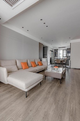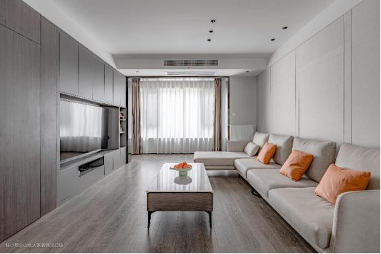 客厅做的是无主灯设计,以此满足不同场景的使用需求。在颜色方面,大面积用到灰色同色系过渡,使整个空间更加和谐统一,给人以含蓄稳重的视觉美感。