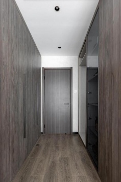 主卧过道区域做了一组另类的“衣帽间”。两边均是实实在在的到顶衣柜,实木的质感,分量更足。往里走,便可来到主卧的卫生间区域。