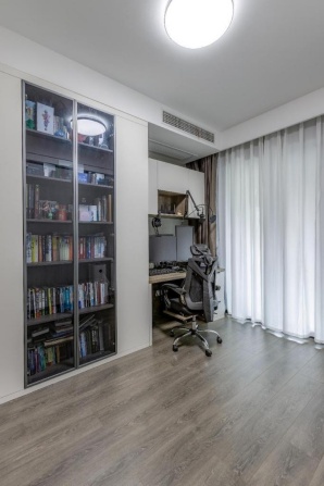 男业主平时非常喜爱电脑游戏,希望有独立的空间供自己休闲娱乐。所以书房空间就“应运而生”。通过打造一面到顶书柜墙,以此收藏业主丰厚的书籍家底。同时针对居室布局的合理规划,还放置了电脑桌椅,男业主得以闲暇之余悠哉游戏。